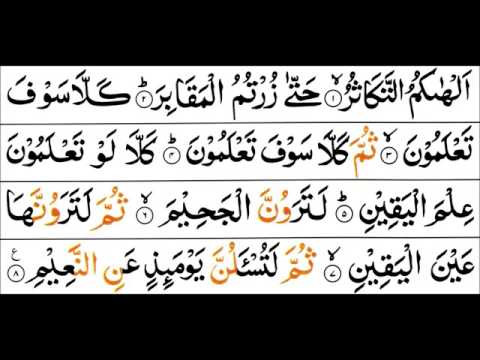Surah Al-Takathur (102) x10 (The Rivalry In World Increase) - Al Haku Muta Kasur - The mutual rivalry for piling up (the good things of this world) diverts you (from the more serious things), Until ye visit the graves. But nay, ye soon shall know (the ...